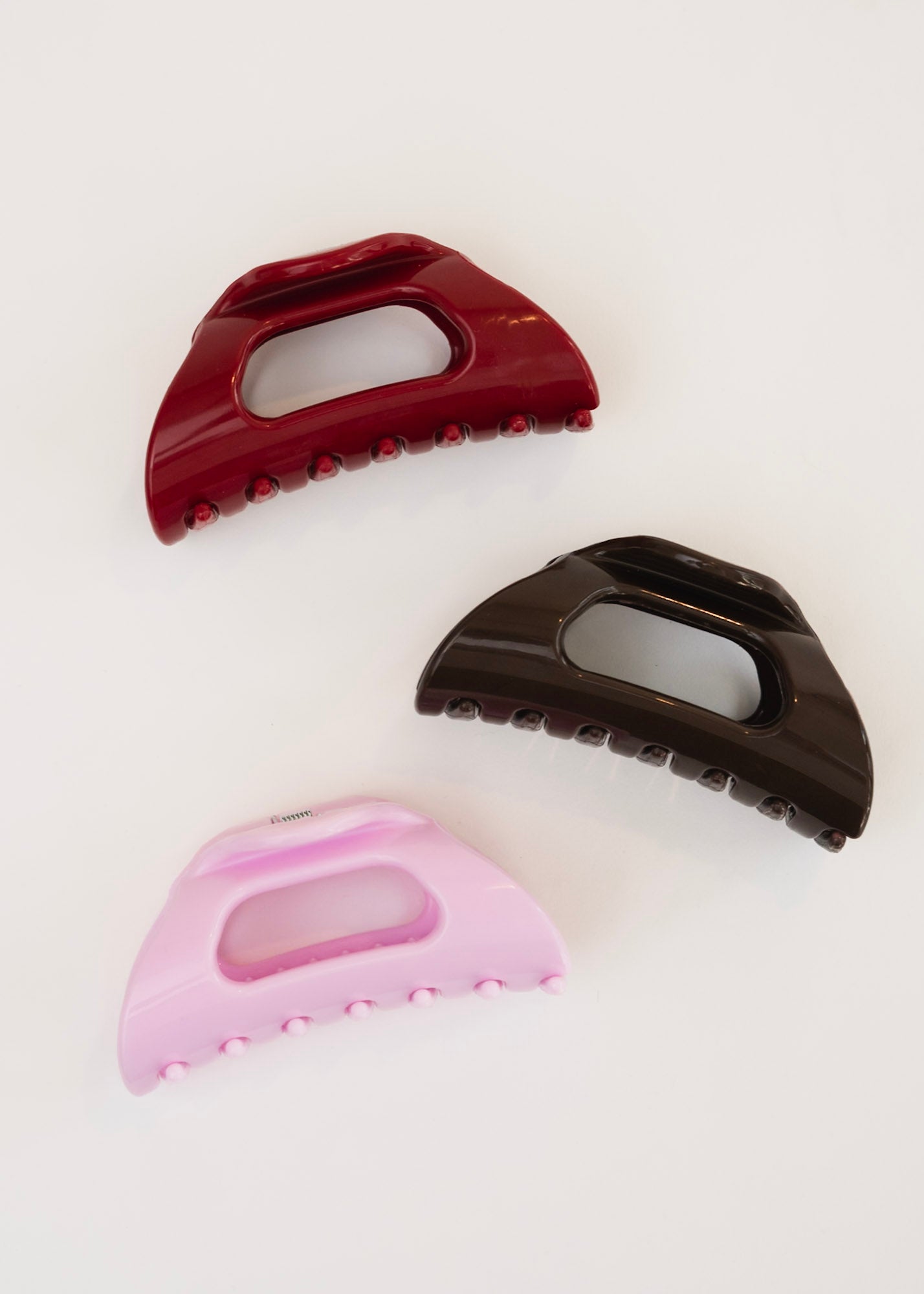 The Brunette Trio incudes one Espresso Cozy Clip®, one Wine Red Cozy Clip®, and one Baby Pink Cozy Clip®.